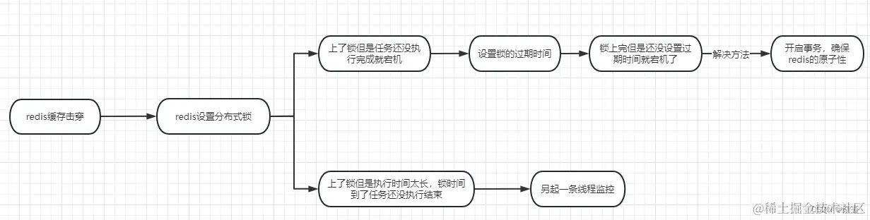 因为会出现缓存击穿的情况是都是并发量很大,如果给进程上锁,一把锁肯定锁不住,这种情况对性能消耗太大了,所以选择采用分布式锁,但是这时候有可能出现一种情况就是锁上了但是还没执行完成就宕机了,那其他进程就会一直在等待锁的释放,造成资源消耗,这时候需要对锁设置过期时间,但是设置过期时间也会产生问题,因为过期时间是在上锁之后设置的,所以有可能出现一种情况,在Redis上锁之后,还没来得及设置过期时间就宕机了,那其他线程还是在等待。这就考察我们对Redis的熟练性了,客户端在使用 MULTI 开启了一个事务之后,却因为断线而没有成功执行 EXEC ,那么事务中的所有命令都不会被执行。另一方面,如果客户端成功在开启事务之后执行 EXEC ,那么事务中的所有命令都会被执行。