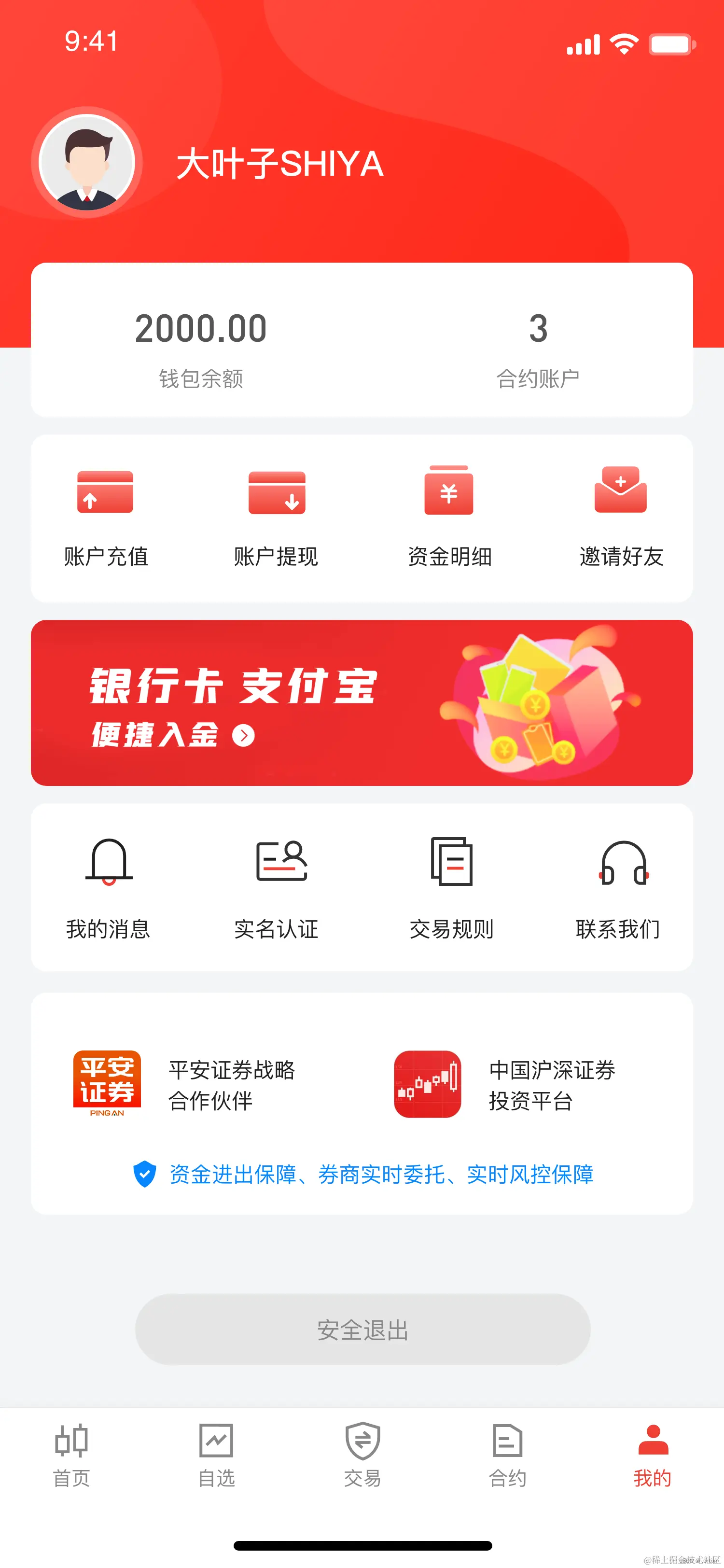 我的页面包含用户账号、资金、合约数量、实名认证等情况。