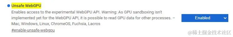 由于WebGPU标准并未正式推出,需要使用开发浏览器,这里推荐 Chrome Canary ,下载后在在Canary中运行效果,由于Canary仍然在变动中,需要在地址栏中输入 chrome://flags/#enable-unsafe-webgpu,然后开启 Unsafe WebGPU 选项。