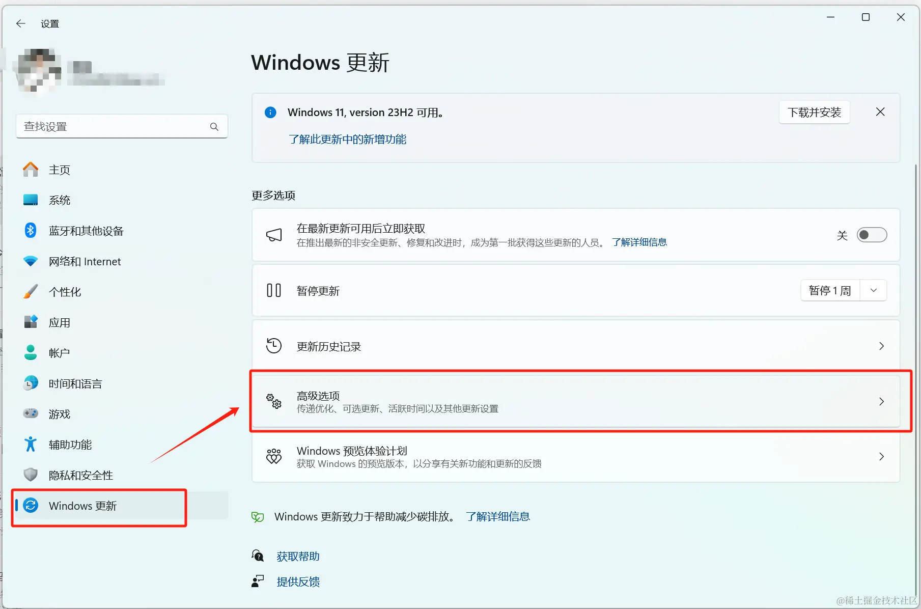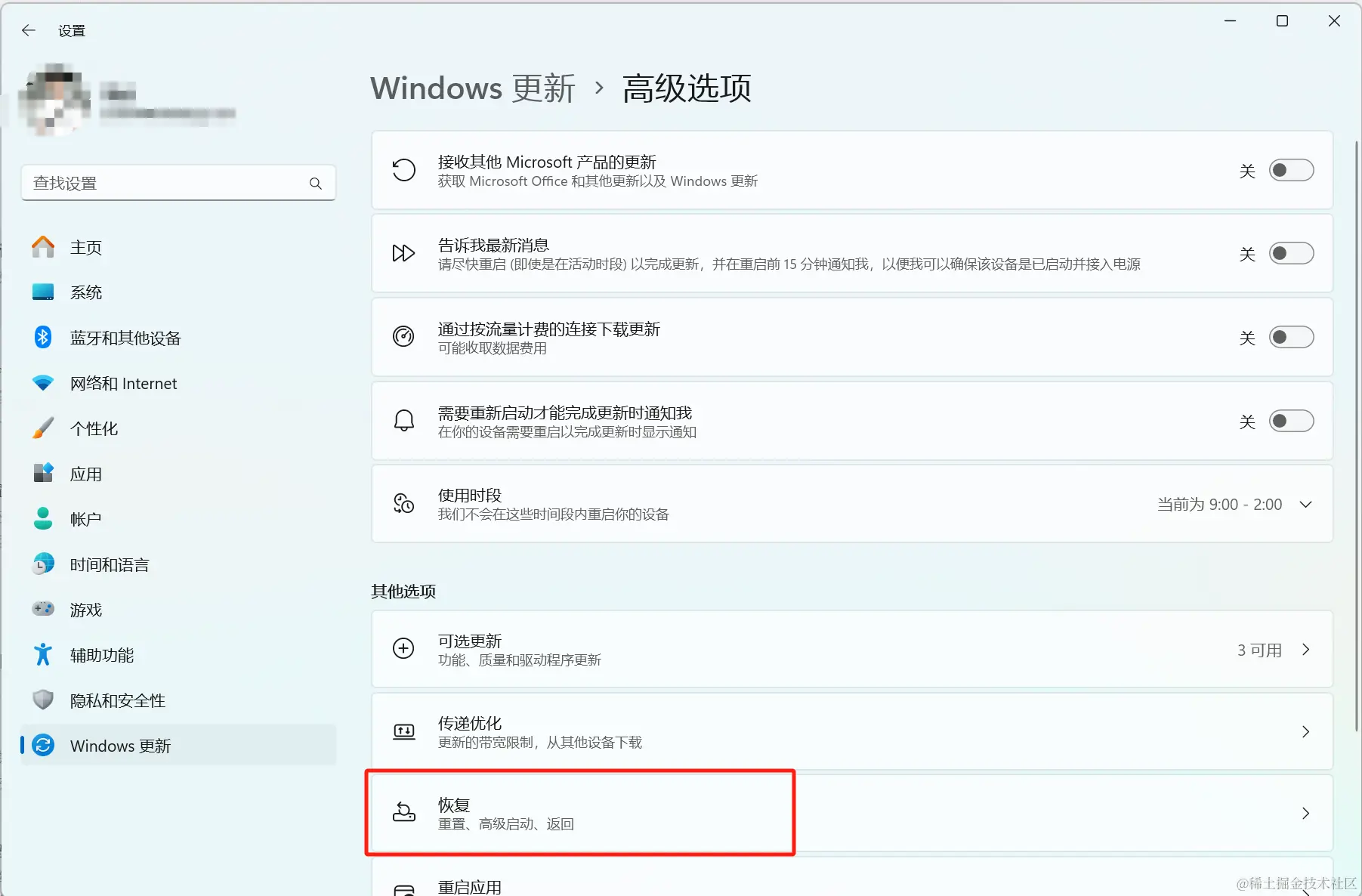 再依次点击Windows更新->高级选项: