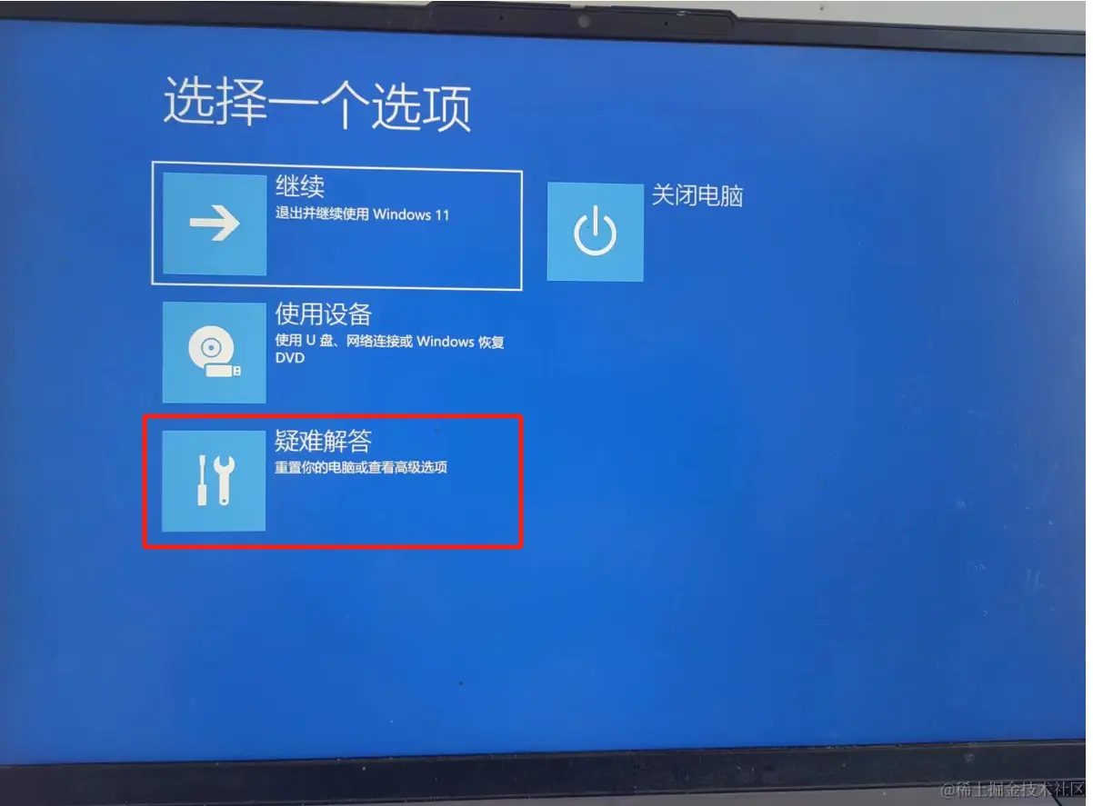 然后你会看到一个和平时启动不一样的画面,点击疑难解答: