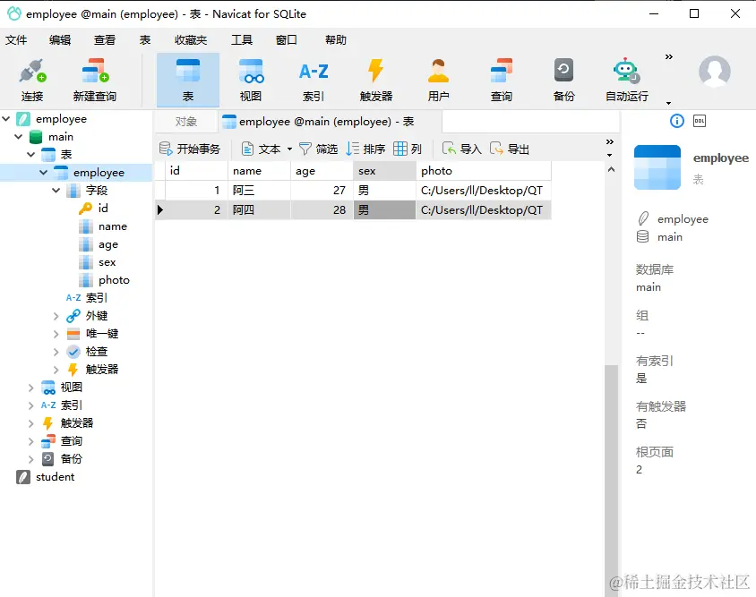 本例就讲解如何将数据库数据显示到 QTableView 上,及查看选择的员工项的全部信息。介绍 Qt 如何使用数据库存储照片的信息。我们知道数据库类型有个 BLOB 数据类型可以用于存储照片信息。但是本例并不那样做,当数据库数据很多时,将照片(二进制数据)存储到数据库里就不是一个