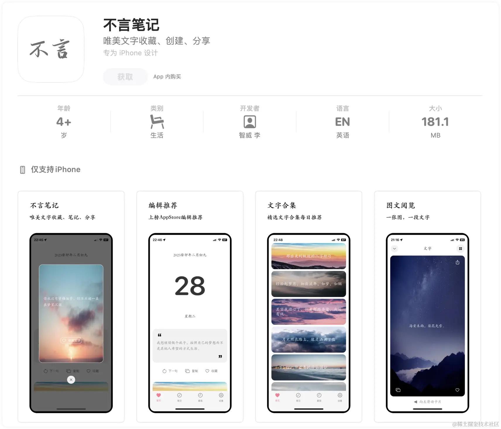 2月之初,终是完成了对2022年的承诺,如约独立开发上架了第一个iOS应用— —不言笔记,也正式开启了我的开发生涯。谁能想到,一个B端的产品经理,竟然成为了iOS独立开发者。
