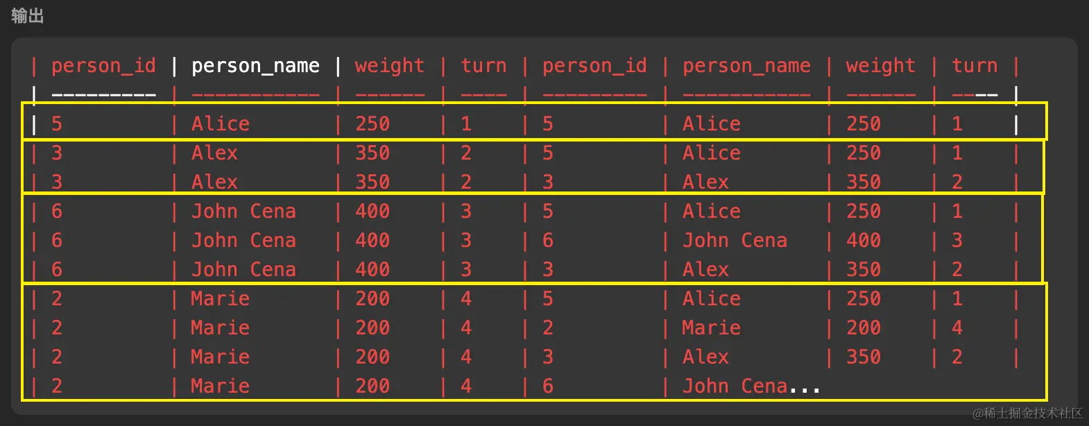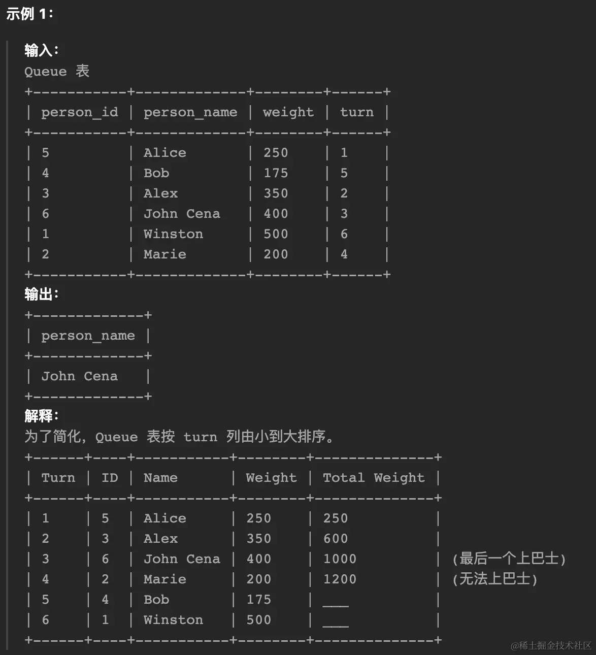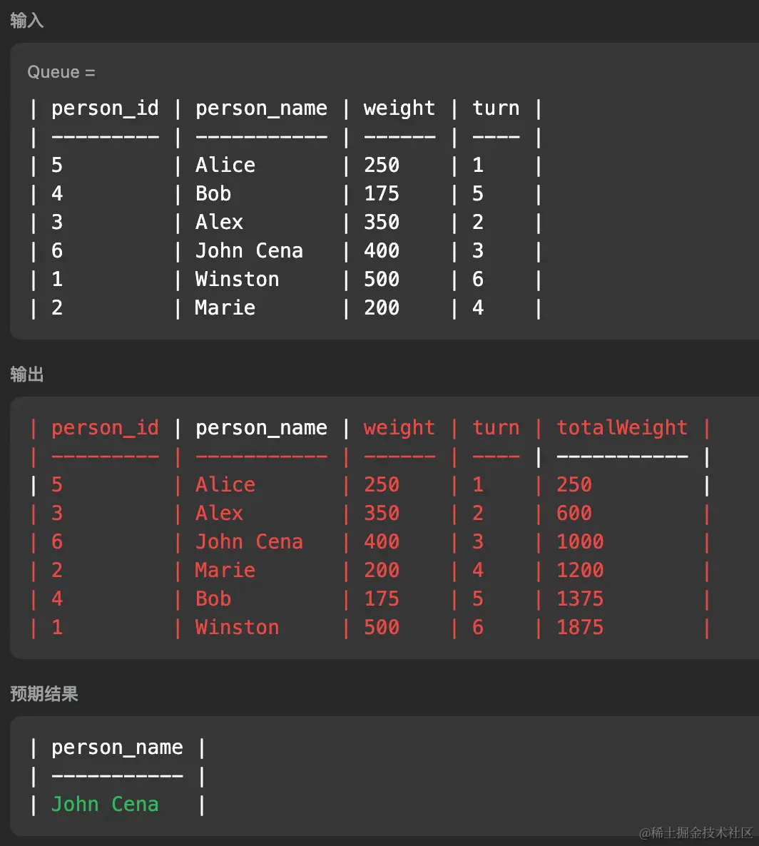 上面因为需要自连接加上笛卡尔积,比自己想的麻烦太多了,性能也不会好到哪里去。最优的方法应该是不用做任何复杂处理,通过上车轮次去累计总重量,如果超重的话返回上一个用户即可。
