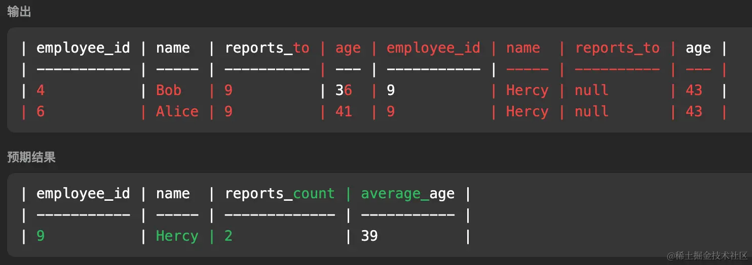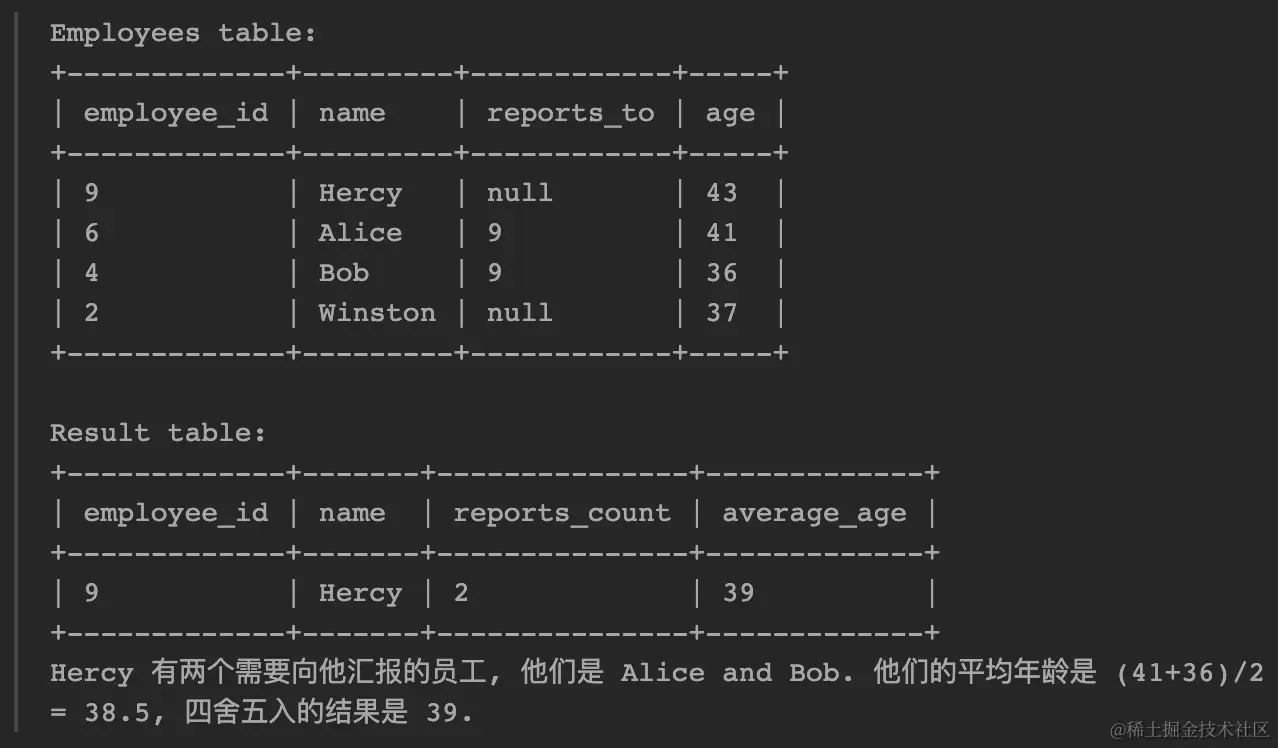 编写SQL查询需要听取汇报的所有经理的ID、名称、直接向该经理汇报的员工人数,以及这些员工的平均年龄,其中该平均年龄需要四舍五入到最接近的整数。