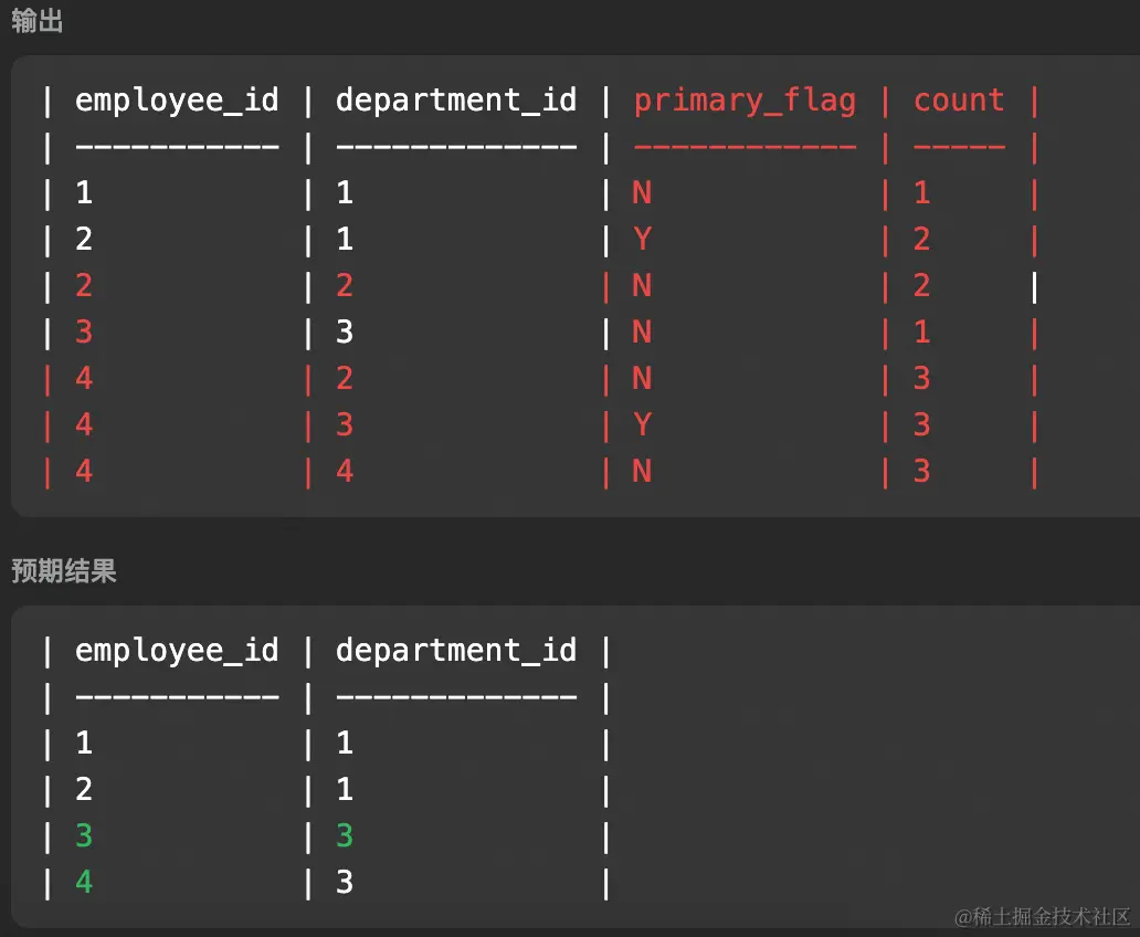 - 然后再通过 where 进行筛选即可。条件:参与部门只有一个,或者有直属部门标记的部门