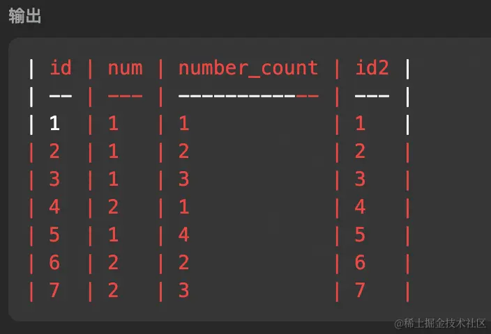 - 每行 select 的时候,当前的数和之前存的数进行比较,如果是相同的数,@count加一。