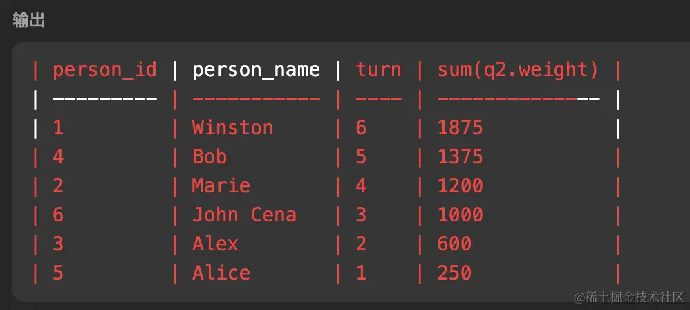 - 先用窗口函数,通过 turn 排序,并用 sum 聚合函数进行累计计算每个上车轮次下,乘客的总重量: