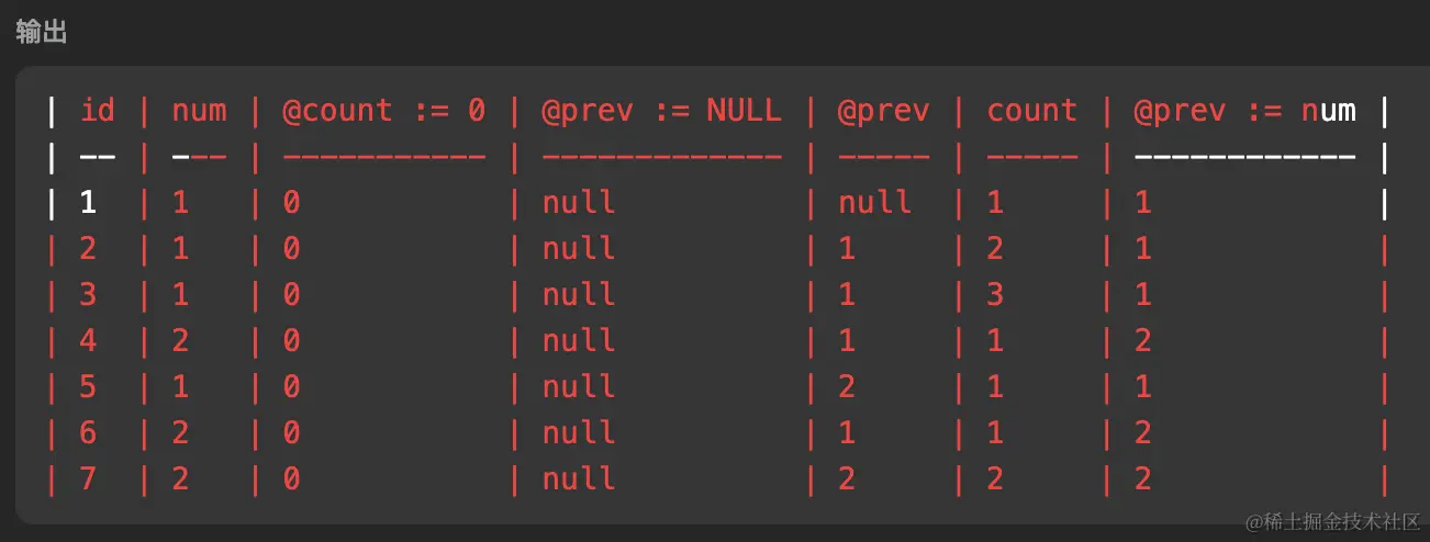 - 定义两个变量,@count用于统计重复次数,@prev用于存储前一个数。