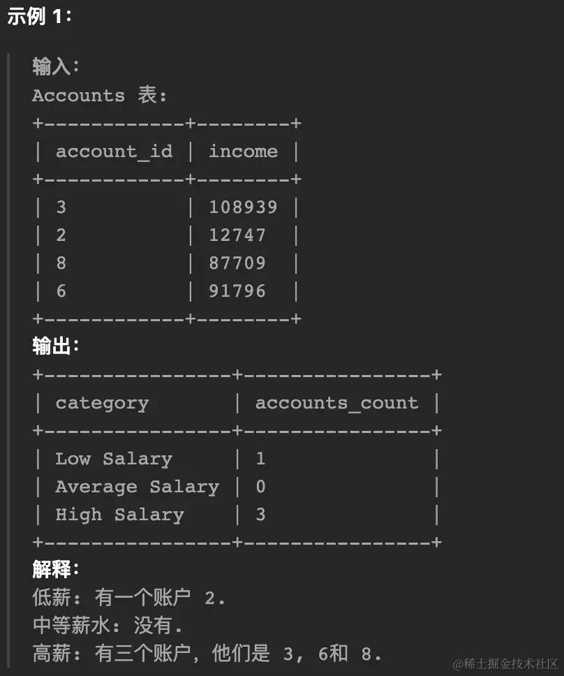 "Low Salary":所有工资 严格低于20000美元。"Average Salary": 包含 范围内的所有工资[$20000, $50000]。"High Salary":所有工资 严格大于50000美元。