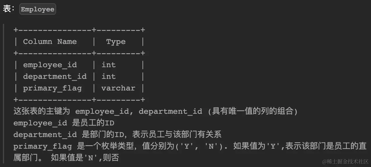 一个员工可以属于多个部门。当一个员工加入超过一个部门的时候,他需要决定哪个部门是他的直属部门。请注意,当员工只加入一个部门的时候,那这个部门将默认为他的直属部门,虽然表记录的值为'N'.