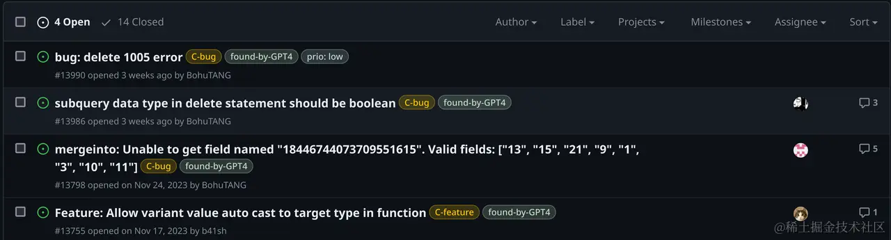 随着 Databend 开源社区的快速发展,新功能的持续增加和现有功能的优化提出了新的测试挑战。除了原有的严格且丰富的测试方案之外,我们还引入了 GPT-4 作为质量保障的一个关键环节,帮助我们执行正确性和优化器层面的测试,智能挖掘潜在的 bug ,确保稳定性。
