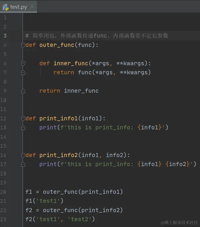 通过增加info,可以让闭包传递参数,稍有经验的开发者一眼就能看出这种带不可变参数的闭包不够通用,因为不可能参数增加一个就再定义一个闭包。在Python中,一旦涉及可变参数,需要使用args和**kwargs,好了,我们用args和**kwargs改造下上面的闭包: