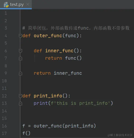 首先最简单的闭包是外部函数只传递一个函数引用和内部函数不带参数的闭包。我们在Pycharm中演示下简单闭包: