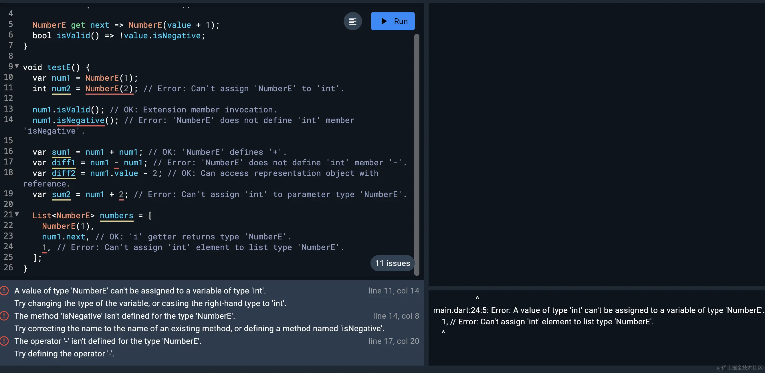 implement其表示类型)被静态地视为全新类型,与其表示类型不同,所以无法将其分配给其表示类型,并且它不会公开其表示类型的成员,例如NumberE不能为 int ,并且 :extension type NumberE(int value) { NumberE operator +(NumberE other) => NumberE(value + other.value); NumberE get next => NumberE(value + 1); bool isValid() => !value.isNegative; } void testE() { var num1 = NumberE(1); int num2 = NumberE(2); // Error: Can't assign 'NumberE' to 'int'. num1.isValid(); // OK: Extension member invocation. num1.isNegative(); // Error: 'NumberE' does not define 'int' member 'isNegative'. var sum1 = num1 + num1; // OK: 'NumberE' defines '+'. var diff1 = num1 - num1; // Error: 'NumberE' does not define 'int' member '-'. var diff2 = num1.value - 2; // OK: Can access representation object with reference. var sum2 = num1 + 2; // Error: Can't assign 'int' to parameter type 'NumberE'. List<NumberE> numbers = [ NumberE(1), num1.next, // OK: 'i' getter returns type 'NumberE'. 1, // Error: Can't assign 'int' element to list type 'NumberE'. ]; }
