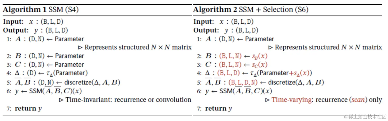 算法1和算法2展示了作者使用的主要选择机制。它们的关键区别在于,使得一些参数(, , )成为输入的函数,并伴随整个过程中张量形状的相关变化。具体而言,这些参数现在具有长度维度,意味着模型从时间不变(time-invariant)变为时间变化(time-varying)。这一变化失去了与卷积(公式3)的等效性,对其效率有所影响。