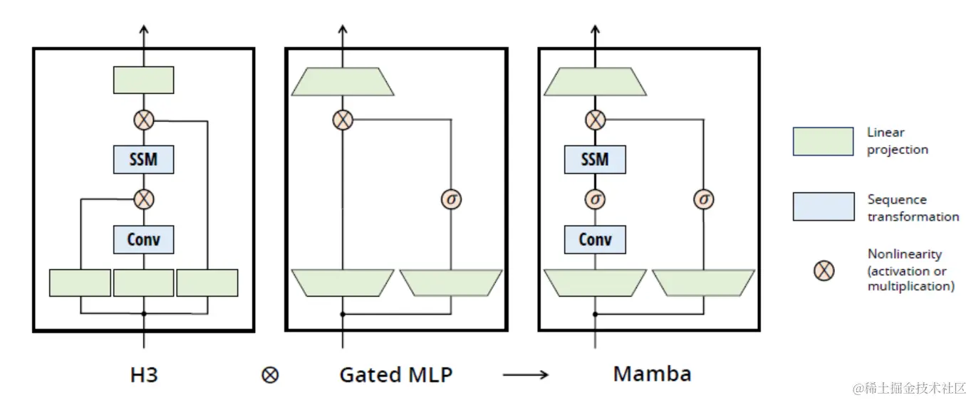 这些描述展示了 SSMs 在架构设计方面的创新和多样性,每种方法都试图通过不同的技术改进来提高模型的性能和效率。这里介绍了它是如何通过在 SSM 之间引入门控连接和局部卷积来增强模型处理能力的。这些架构的共同点在于它们都试图通过结构化的方法来捕获和处理序列数据的依赖关系,同时提高计算效率。