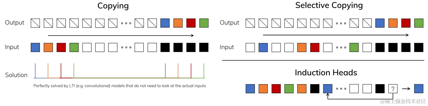 上图描述了几个不同的任务,用于展示时间不变模型如线性递归和全局卷积的局限性,以及选择性模型在处理这些限制方面的优势。这些任务包括:标准复制任务(左图):这个任务在输入和输出元素之间有恒定的间距,可以通过时间不变模型,如线性递归和全局卷积轻松解决。