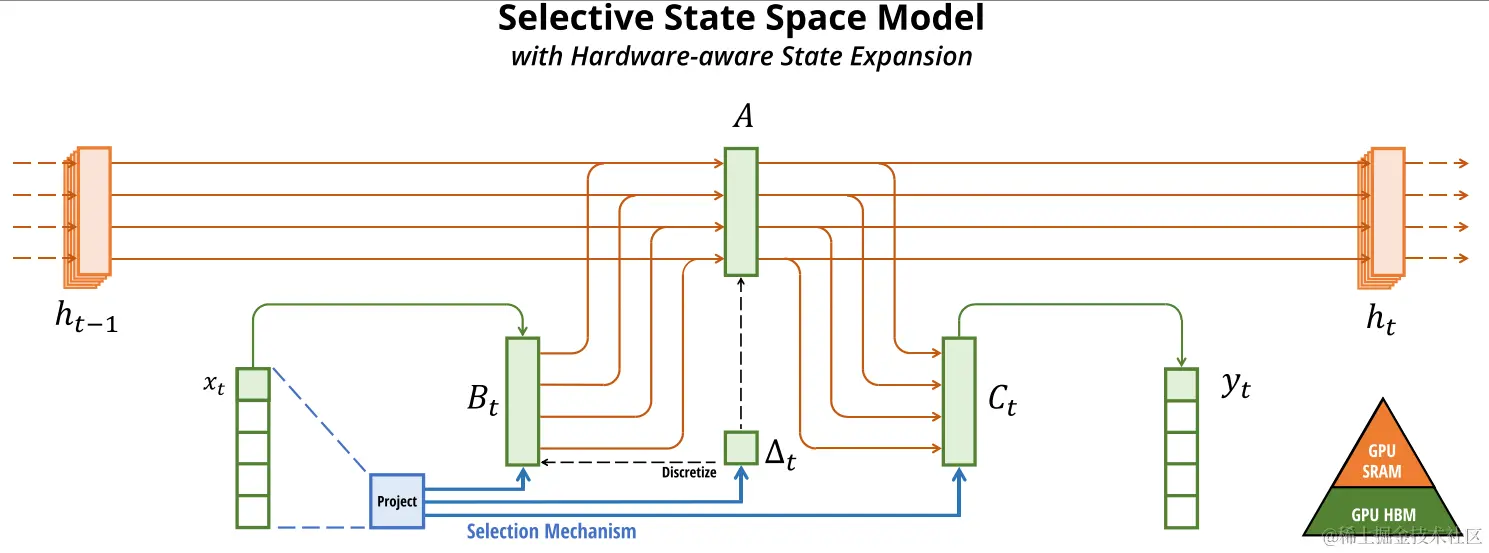 上图提供了结构化状态空间模型(SSM) 如何处理输入数据的概述。具体来说,它说明了输入 的每个通道是如何通过更高维度的潜在状态 独立映射到输出 的。例如,如果输入有 5 个通道(),则通过维度为 的潜在状态处理它们。先前实现的 SSM 由于其在处理大有效状态时的效率而被注意到,这个大有效状态是维度 和 ,以及批量大小 和序列长度 的乘积。这种效率是通过避免这个大状态的实体化(materialization of the large state)并改用依赖时间不变性的替代计算路径来实现的——意味着参数(,,,)随时间保持不变。文本提到了一个“选择机制”,在此上下文中引入了输入依赖的动态。这意味着参数现在可能会根据输入变化,引入了更动态且可能更准确的时间数据建模。然而,这也需要一个“谨慎的硬件感知算法”,因为增加的复杂性和计算要求。为确保模型可以在特定的硬件配置上有效执行而做的优化或考虑,例如提到的 GPU 及其 SRAM 和 HBM(高带宽内存)。