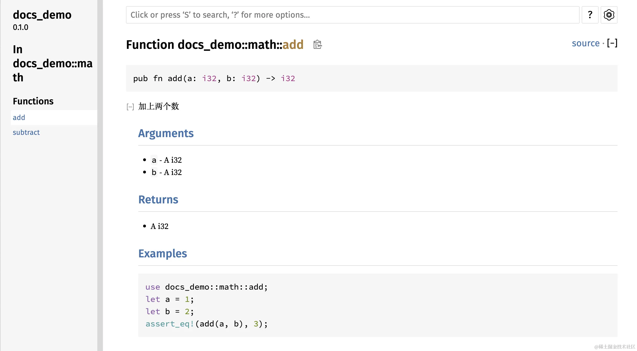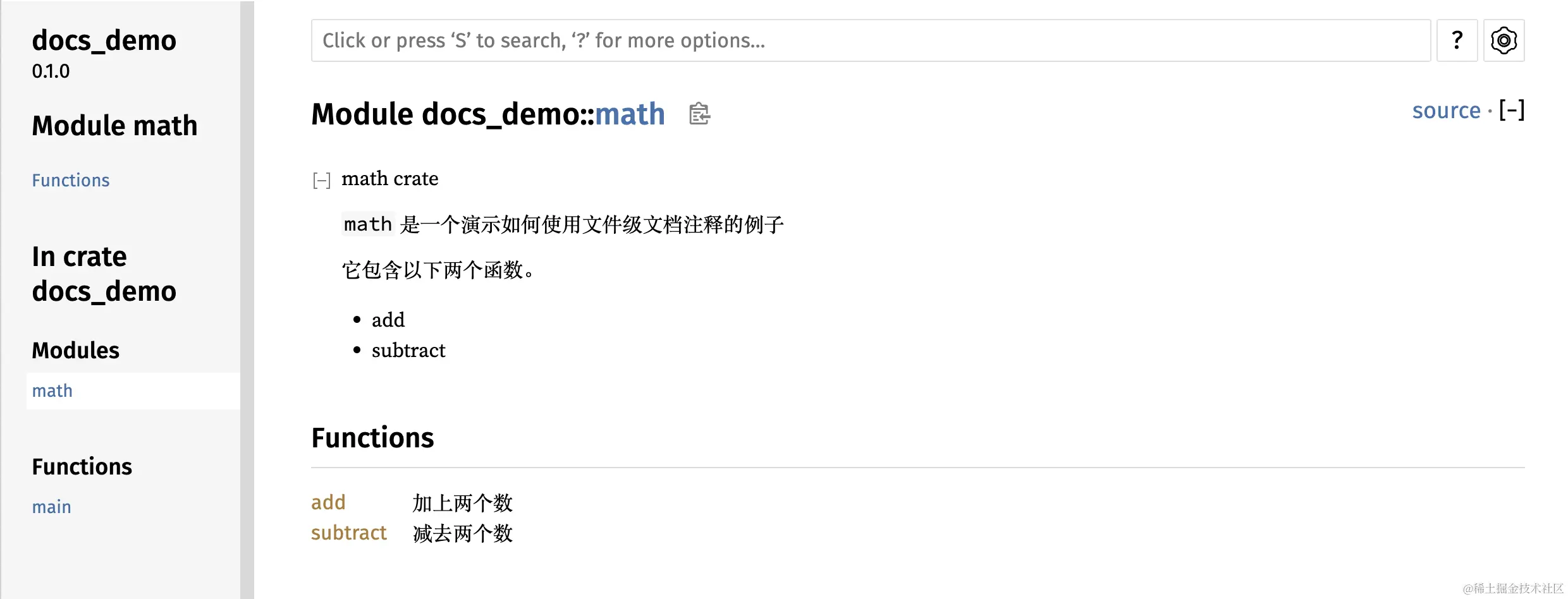 在上面的示例中,从 /// 开始的行,直到函数定义之前的部分都将成为这个函数的文档注释。rustdoc 工具将会捕获这些注释并用它们生成 HTML 文档。