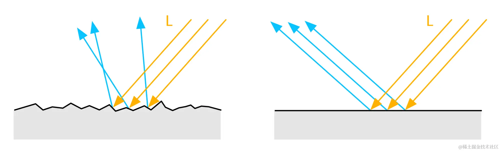 微平面BRDF是一个用于该目的的好的物理上可行的BRDF。这样的BRDF认为表面在微观层面上并不平滑,而是由大量随机排列的平面碎片组成,称为微平面。图2显示了在微观层面上平坦界面和不规则界面之间的区别: