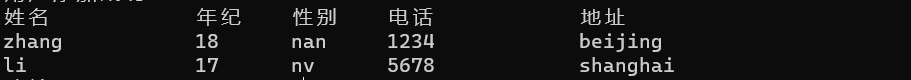 printf("%-15s\t%-5s\t%-5s\t%-12s\t%-30s\n", "姓名", "年纪",