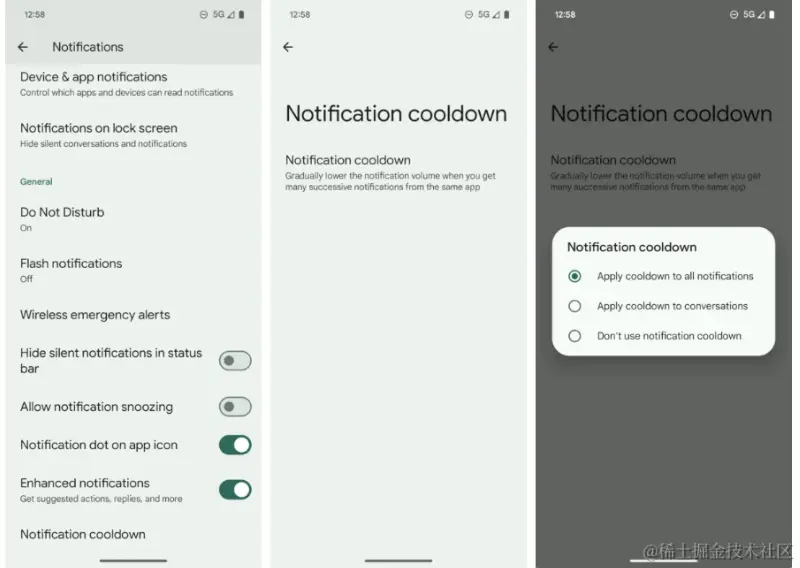 谷歌官方对“通知冷却”的描述是,“当您收到来自同一应用的许多连续通知时,会逐渐降低通知音量”。