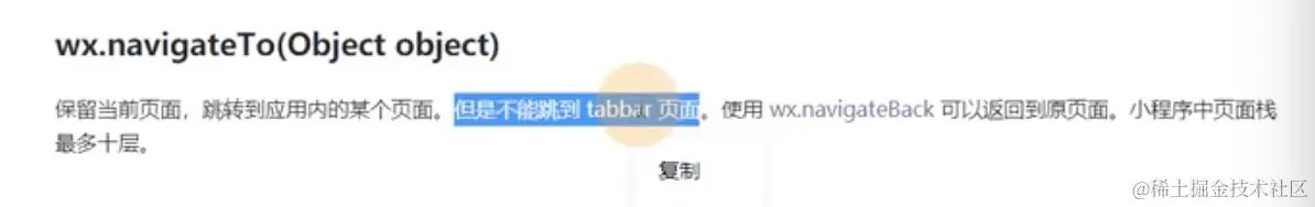 保留当前页面,跳转到应用内的某个页面。但是不能跳到 tabbar 页面。使用 wx.navigateBack 可以返回到原页面。小程序中页面栈最多十层。