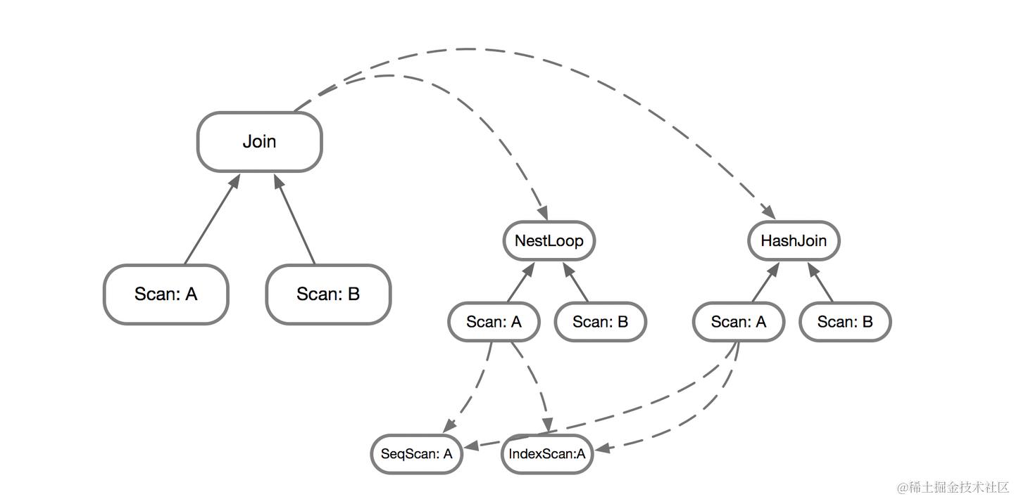 - Implementation:逻辑算子可以转换成物理算子;例如Join转换成NestLoop或者HashJoin等