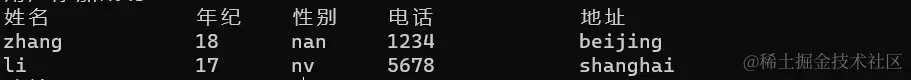 printf("%-15s\t%-5s\t%-5s\t%-12s\t%-30s\n", "姓名", "年纪",