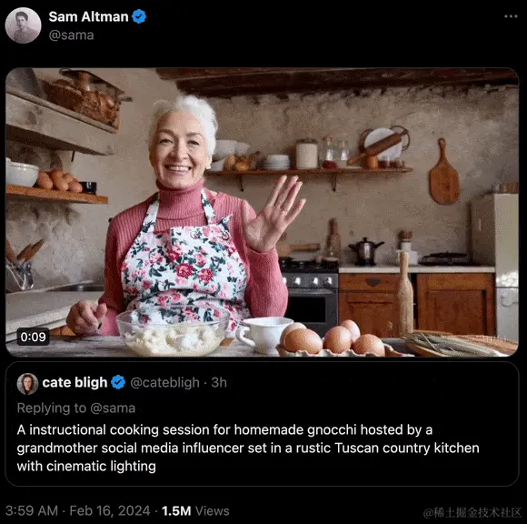 一段视频显示,一位身穿围裙、面带微笑的白发女士邀请观众进入她的厨房。有人向奥特曼要一段“由一名祖母辈的网红主持的自制团子烹饪课程,背景是一个质朴的托斯卡纳乡村厨房,并配有电影级的灯光”,之后Sora生成了这段AI视频。