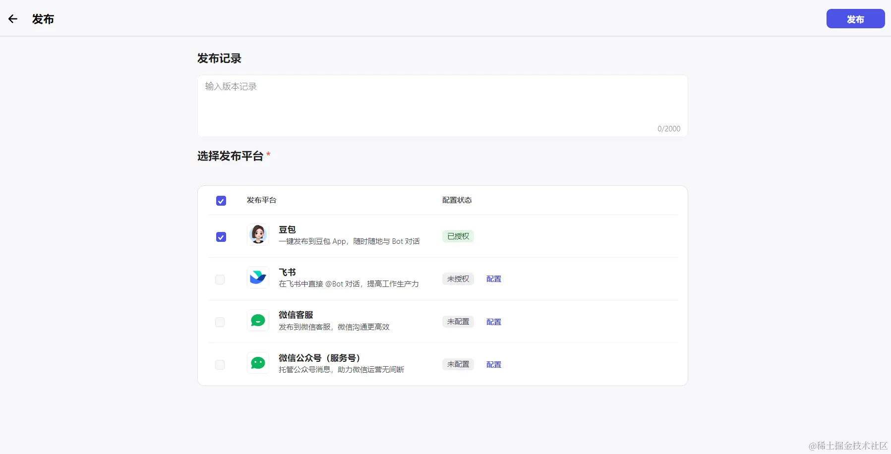 创建好的Bot可以发布到豆包、飞书、微信客服及微信公众号。