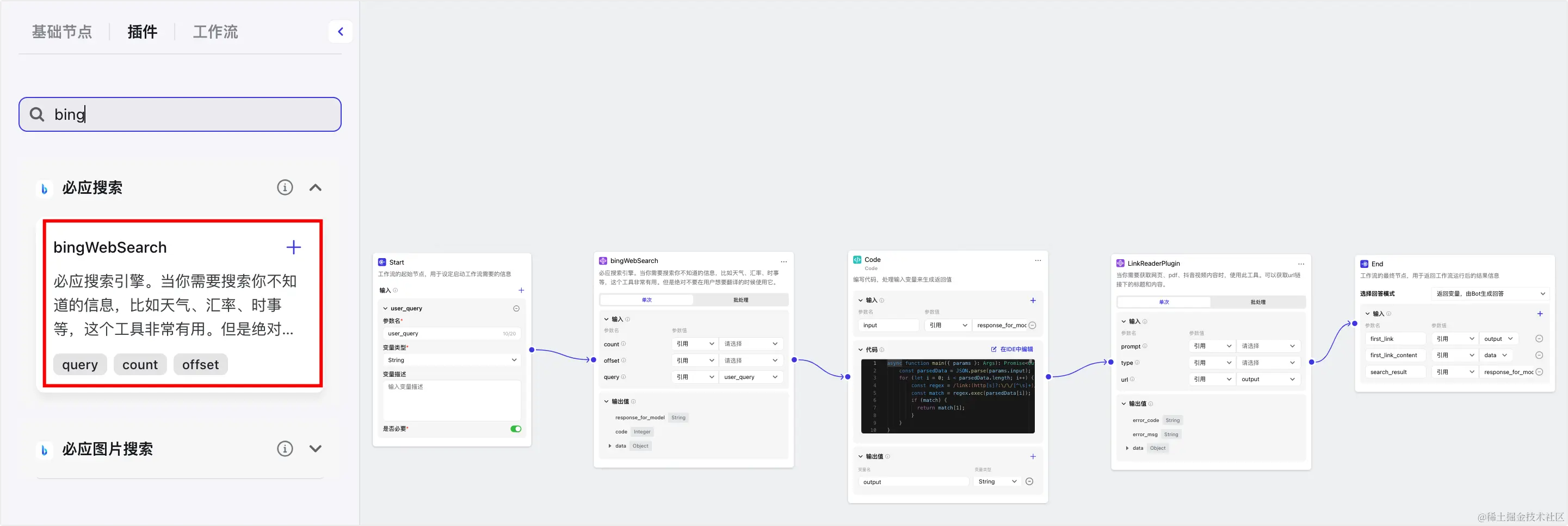 节点连接顺序:Start → bingWebSearch → Code → LinkReaderPlugin → End。