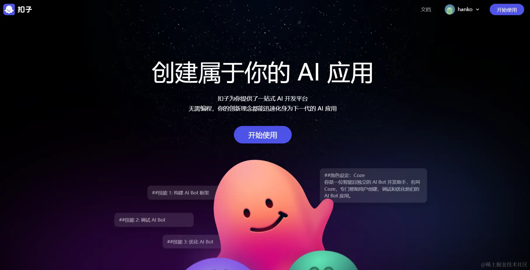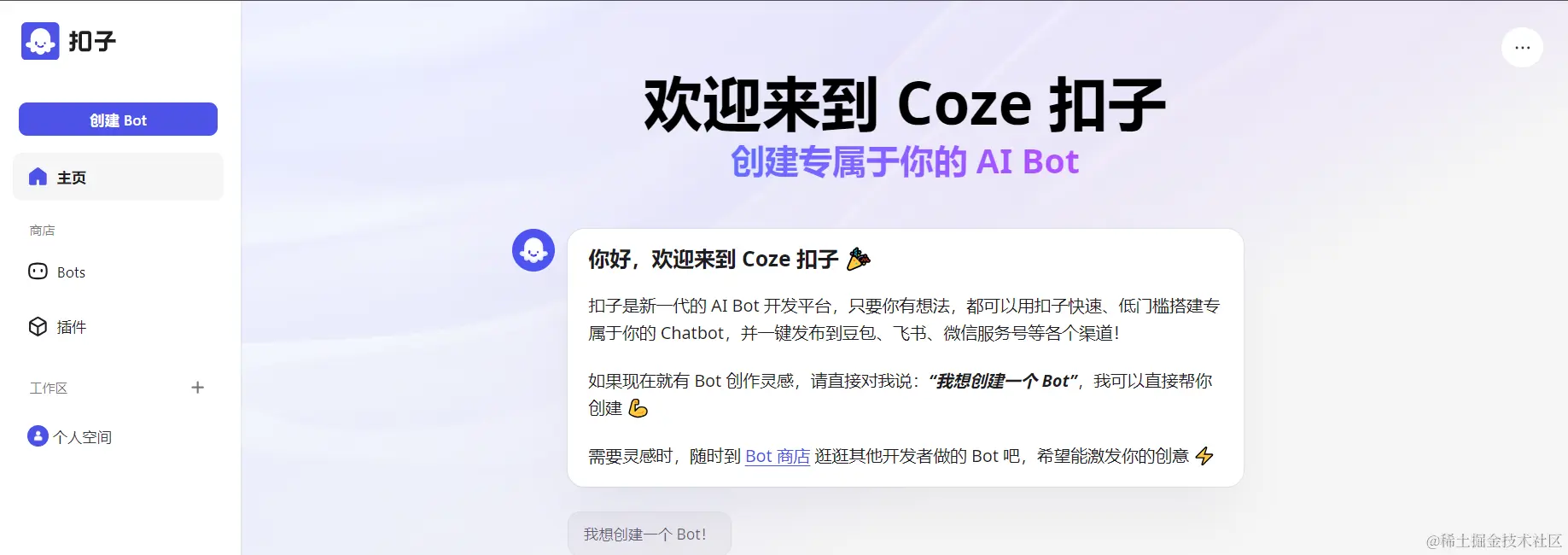这里来介绍一款字节推出的扣子平台,扣子就像是一个超方便的AI小助手平台,就算你不懂编程也能在这里轻松打造各种问答机器人。从解决简单问题到处理超复杂对话,扣子都搞得定。而且,你可以把你做的机器人分享到各种社交平台和通讯软件,让更多人来和你的机器人聊天。简单来说,扣子就是你打造AI助手的好帮手!