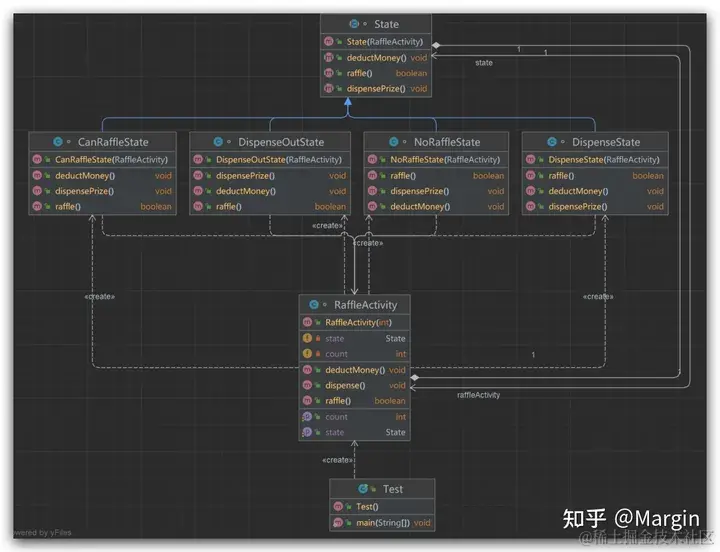 RaffleActivity持有四个活动状态,每个活动状态中都有RaffleActivity对象,为的就是切换状态,比如有人中奖了,就要将RaffleActivity的状态变为DispenseState