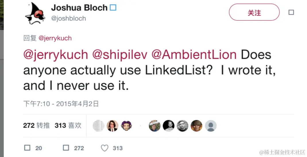作为ArrayList的同门师兄弟,LinkedList的师门地位逊色不少,除了在做算法题的时候我们会用到它之外,在实际的开发工作中我们极少使用它,就连它的创造者都说:“I wrote it,and I never use it”,想想颇有点好笑,但这并不影响我们去学习它,个人认为它底层的链表逻辑对于我们代码思想的培养还是挺有帮助的。