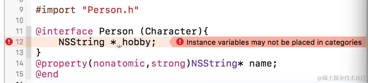 会发现有报错,系统告诉你在分类中不能添加实例变量,也就是说,Person类的结构体中的实例变量链表(ivars)不可扩展,OC不支持往已存在的类中添加实例变量,因此不管是系统库提供的类,还是我们自己定义的类,都无法动态添加成员变量。有人可能会说,系统有个class_addIvar方法啊,怎么不行? 这个方法的用处是:我们通过运行时来创建一个类时,我们才可以使用class_addIvar函数添加实例变量。但是这个方法也只能在objc_allocateClassPair函数与objc_registerClassPair之间调用。另外,这个类不能是元类。