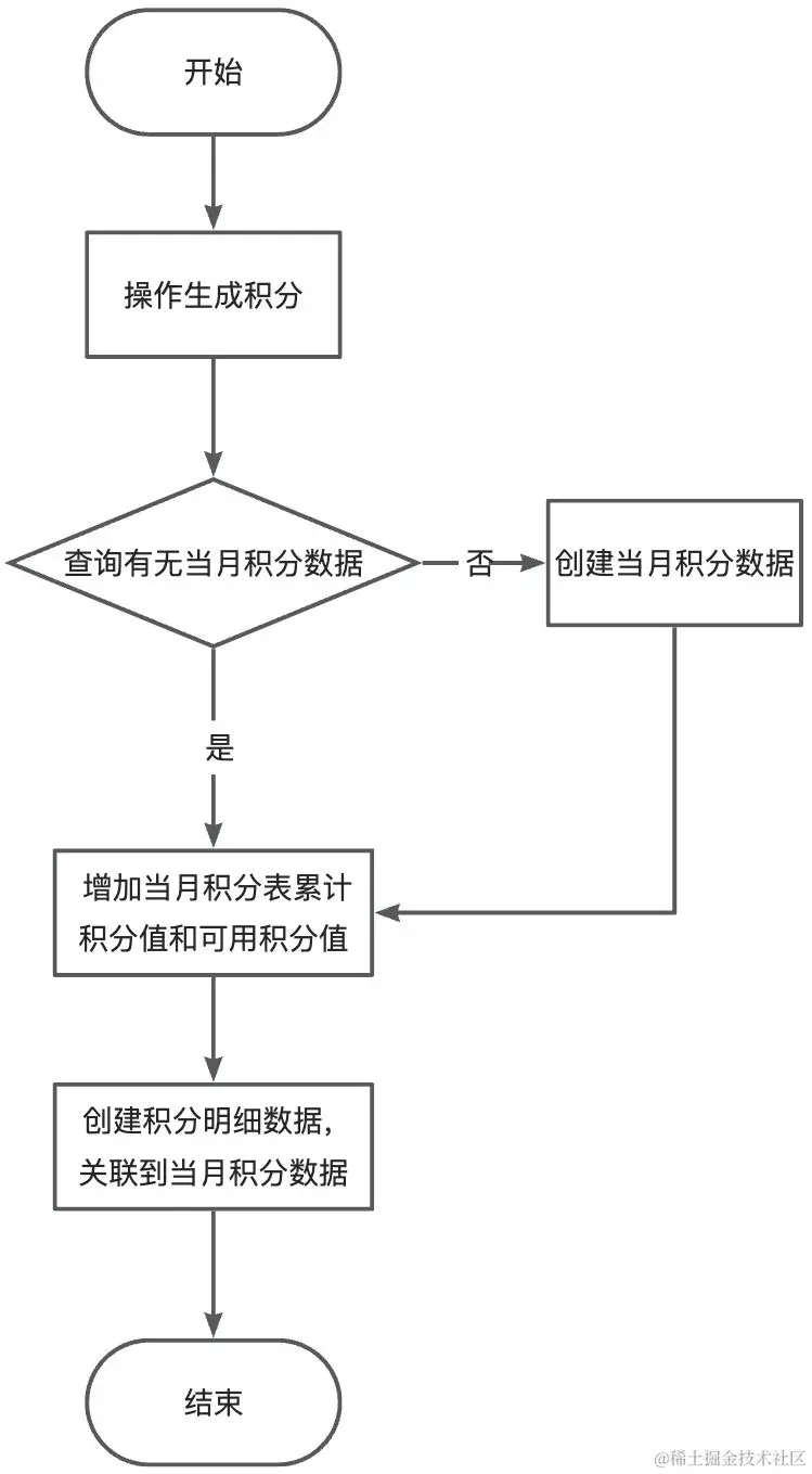 积分由用户操作生成,同时存储于月度积分表和积分明细表。