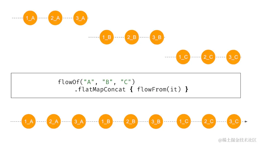 - flattenConcat 把嵌套的Flow of Flows展平为一个Flow,内层的每个流都是按顺序拼接在一起的,串行拼接。比如Flow of 4 Flows,内层有四个管道,那就就变成了『内层1』->『内层2』->『内层3』->『内层4』。