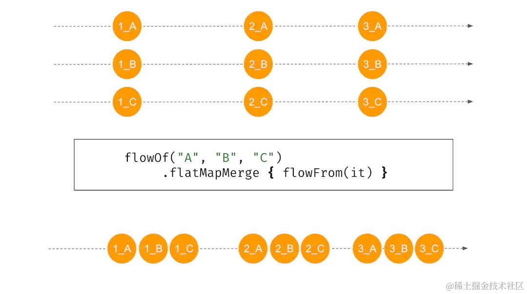- flattenMerge 把Flow of Flows展平为一个Flow,内层的所有Flow是以并发的方式将元素混合流入新管道,是并发式混合,相当于四个管道同时往另一个管道倒水,原流中的顺序会错乱掉。