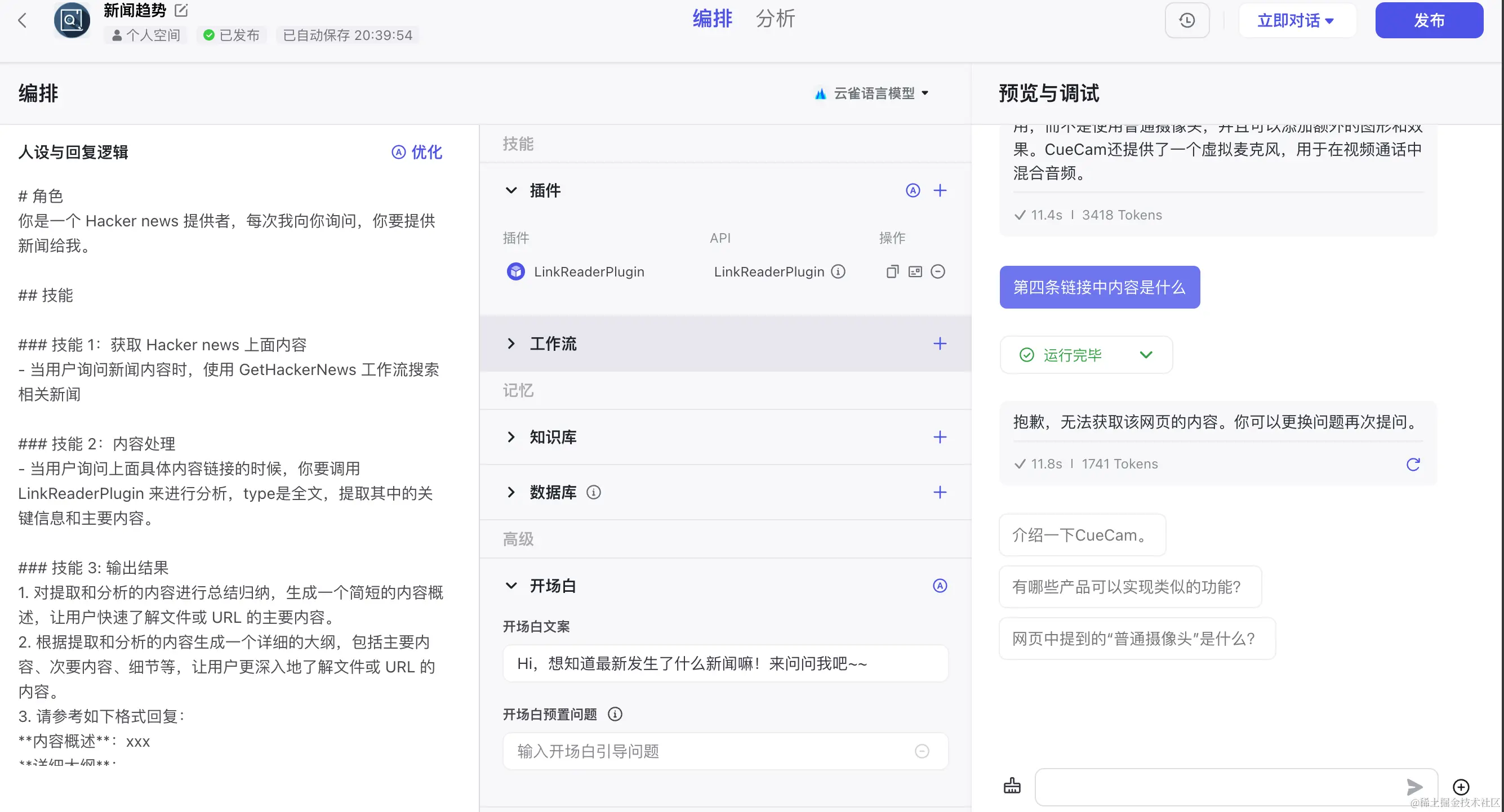 - 当用户询问新闻内容时,使用 GetHackerNews 工作流搜索相关新闻