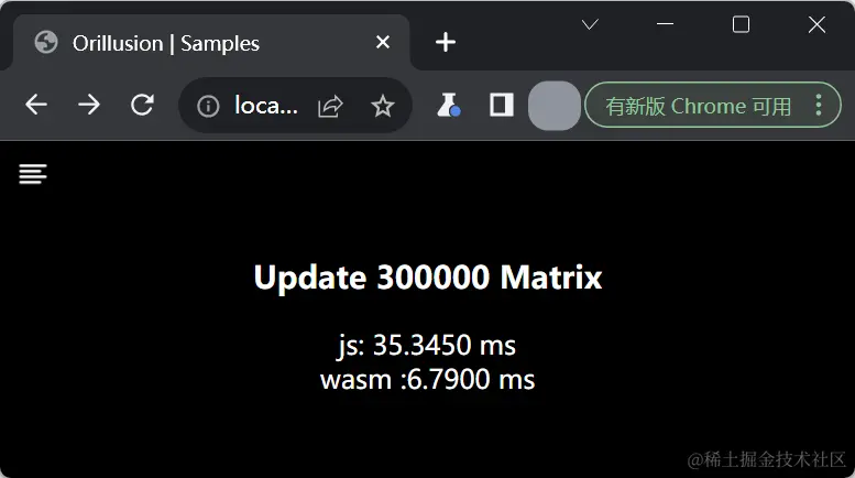 Wasm Matrix功能通过Web assembly编译 c++版本的矩阵计算,弥补JavaScript 大量矩阵计算性能差的问题 ,带来1.8倍以上的矩阵计算性能。纯计算测试对比数据: