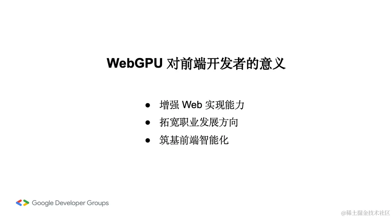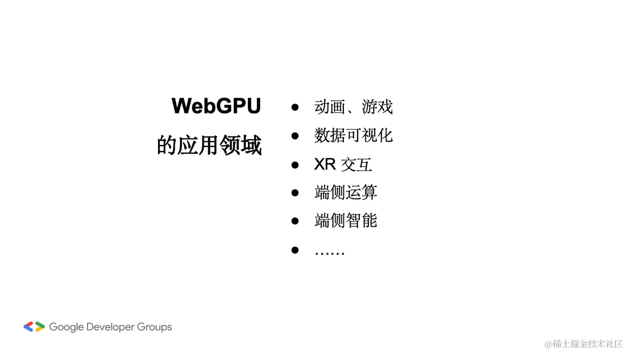 有了WebGPU的高性能计算和渲染性能,很多曾经的场景,依托于Web平台的易传播特性,肯定会得到更好的发展。而未来的XR交互,端侧智能等面向未来的场景,也更加充满了机遇和想象空间。