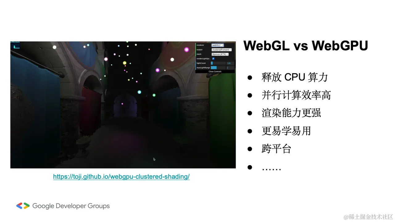 而相比较WebGL,全新的WebGPU标准,可以更好的释放GPU算力,提高并行计算和渲染效率,对前端开发者更容易学习,还有很好的跨平台特性。