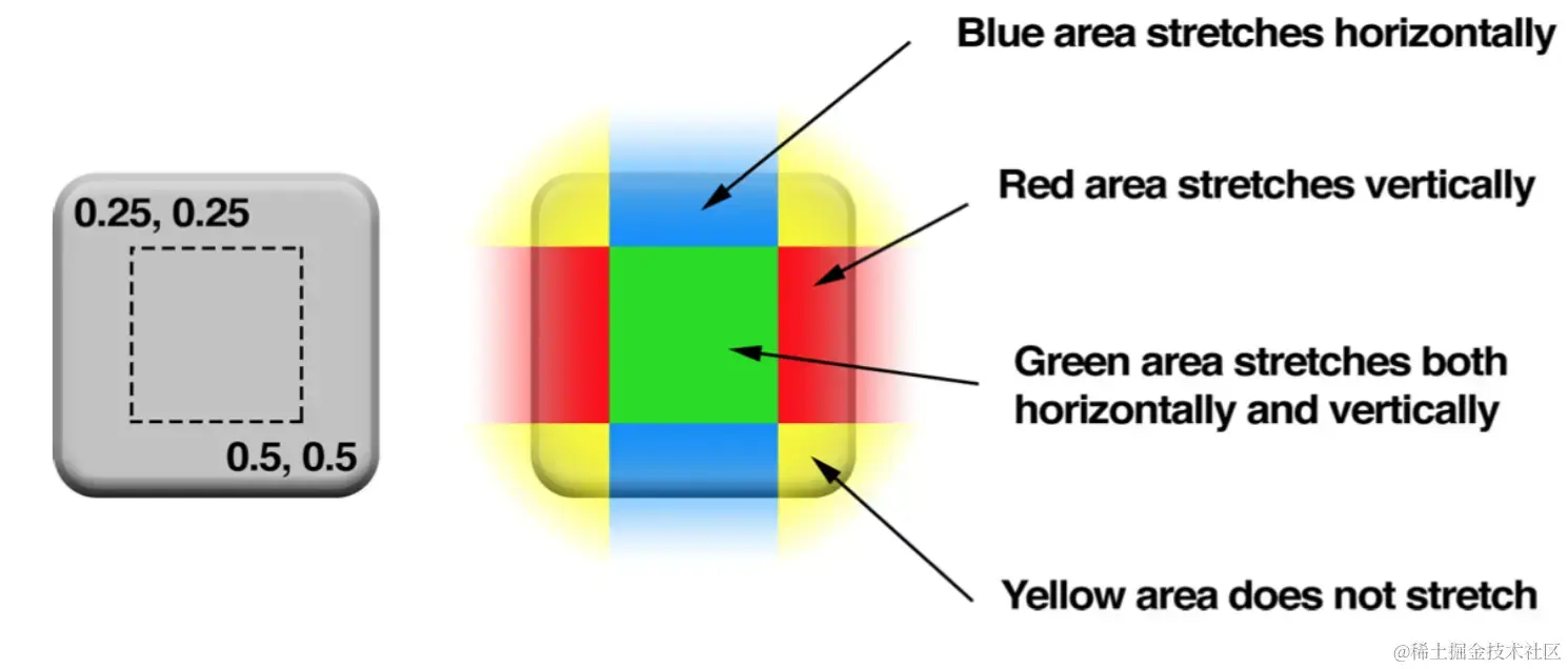 这意味着我们可以随意重设尺寸,边框仍然会是连续的。他工作起来的效果和UIImage里的resizableImageWithCapInsets:方法效果非常类似,只是它可以运用任何寄宿图,甚至包括在Core Graphics运行时绘制的图形。