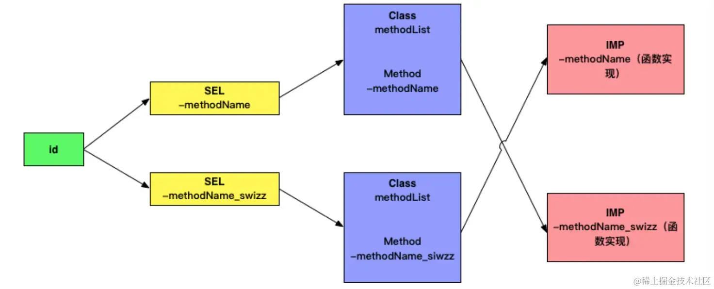 我们说过,方法的调用过程,归根结底是函数指针的调用,在oc的动态语言特性下,我们可以改变Method结构体中IMP函数实现指针的指向:(我们以实例方法为例)