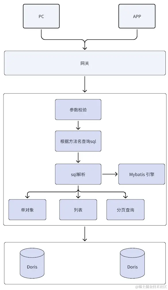 假设语句已经同步到doris,那么怎么进行展现,这里有很多种方式,比如通过BI工具,例如:power bi、dataEase、Davinci等,同时Doris 支持mysql 协议,我们为了让之前的业务改动,对后端接口实现进行了替换,通过 mybatis 动态解析 sql,并调用 doris进行查询,架构如下