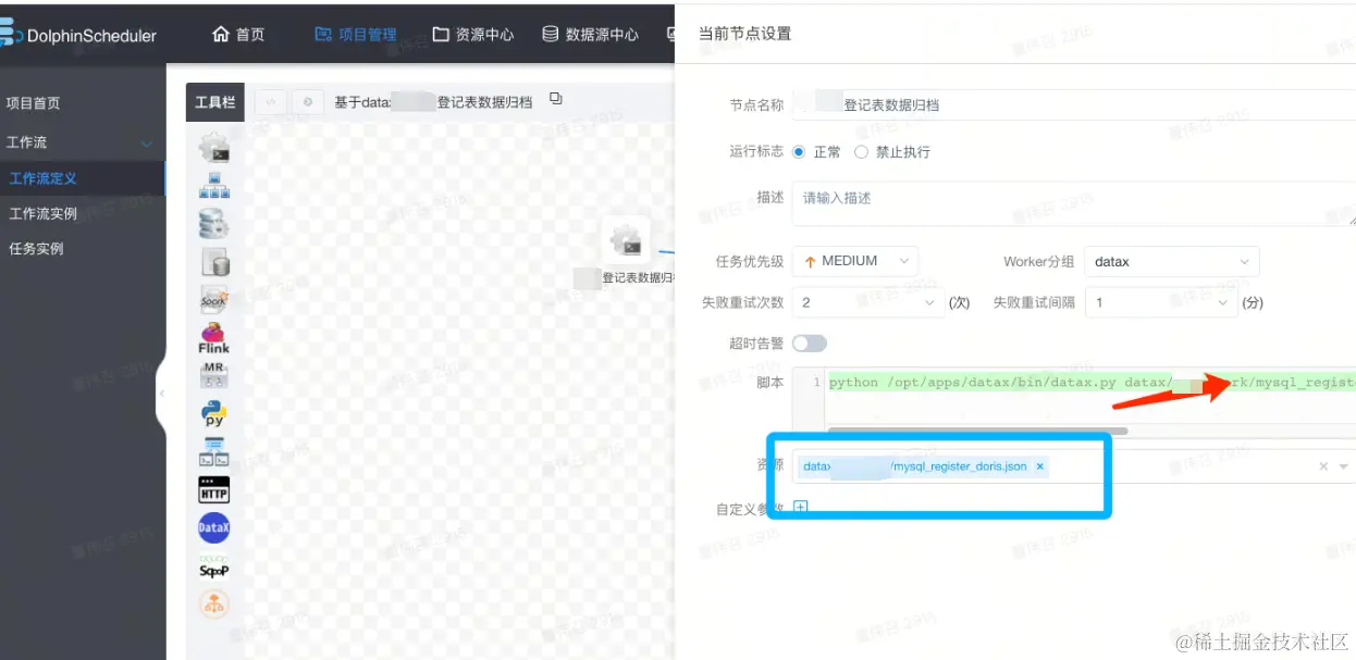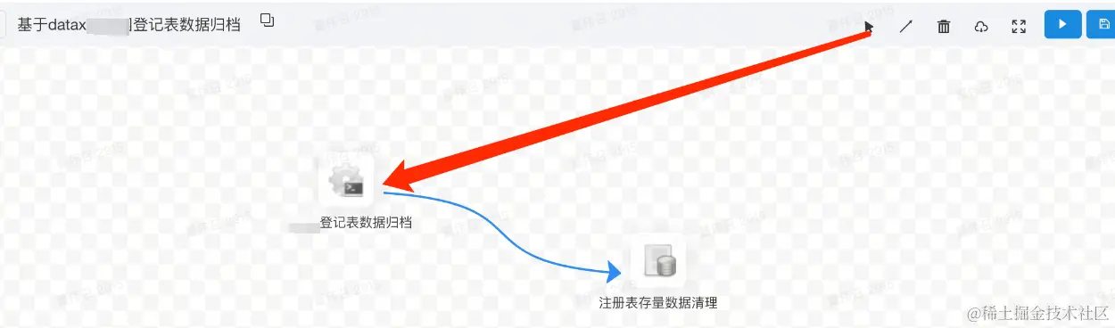 第一步进行datax数据同步第二步进行原数据清理,如下图连线就是依赖关系