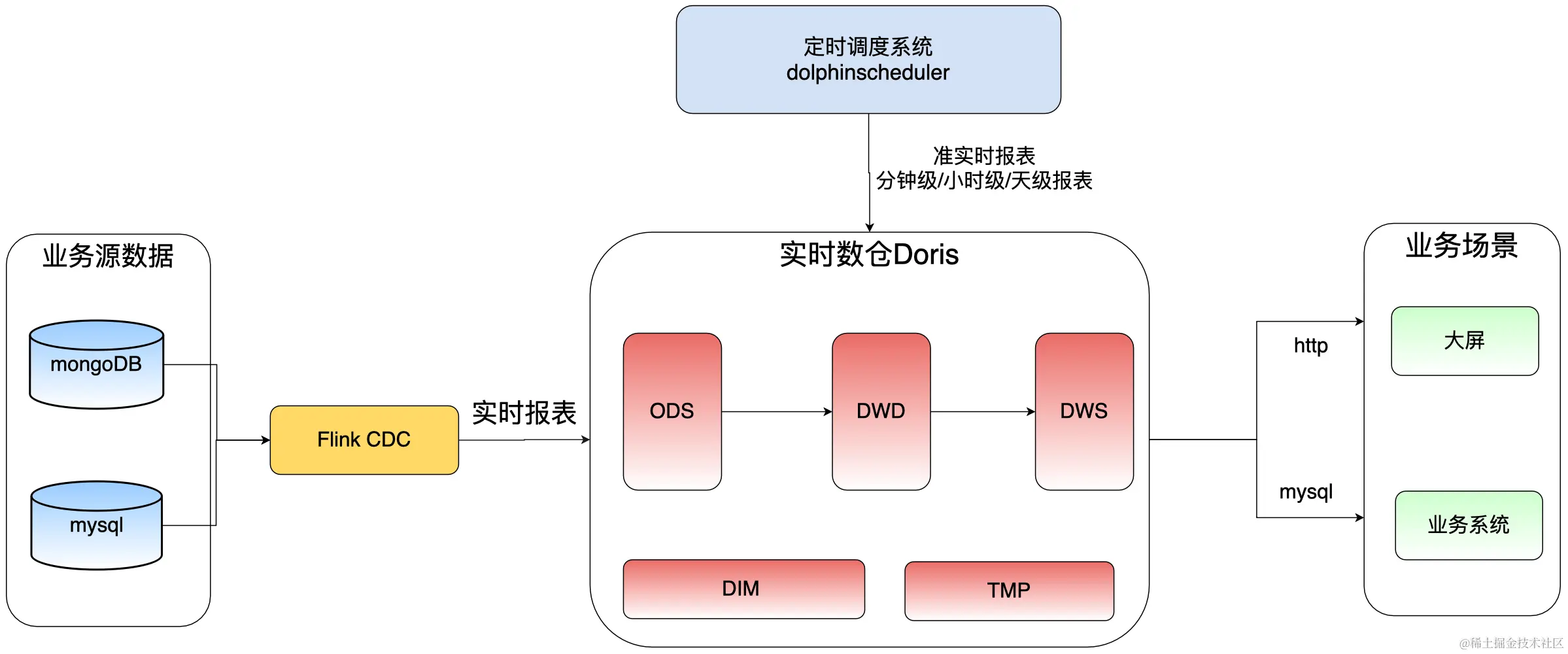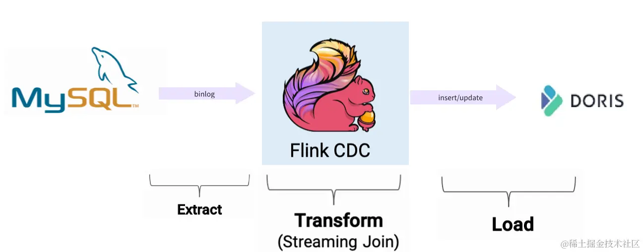实时数据,采用Fink CDC进行捕获,Fink CDC Connectors 是Apache Flink的一组源连接器,使用变更数据捕获 (CDC) 从不同数据库中获取变更,而获取变更是通过Debezium监听Binlog 日志,获取到更新数据以后,可以对数据进行转换,然后在根据doris 提供的Flink 插件Doris flink connecto导入到 Doris 里面