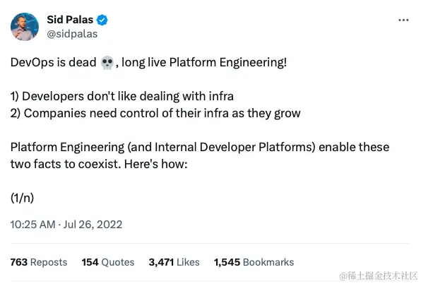 DevOps 本身是一种理念,强调团队协作,使开发团队和运维团队能够紧密合作。尽管强调了自动化和工具的重要性,但它并没有明确指出具体的发展方向。因此,出现了平台工程(Platform Engineering)这一理念。虽然最早是谁提出的已无法考证,但在 2022 年 7 月份,一条Twitter上的消息“DevOps is dead, long live Platform Engineering” 在国内外的 DevOps 圈子迅速传播开来,并得到了广泛的回应。